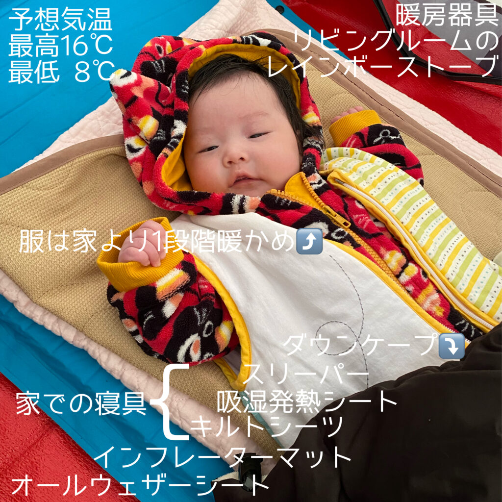 春・秋の赤ちゃんのキャンプでの寝具・防寒対策 4月5月10月11月千葉県勝浦リスッコ・ファミリーキャンプ場。
