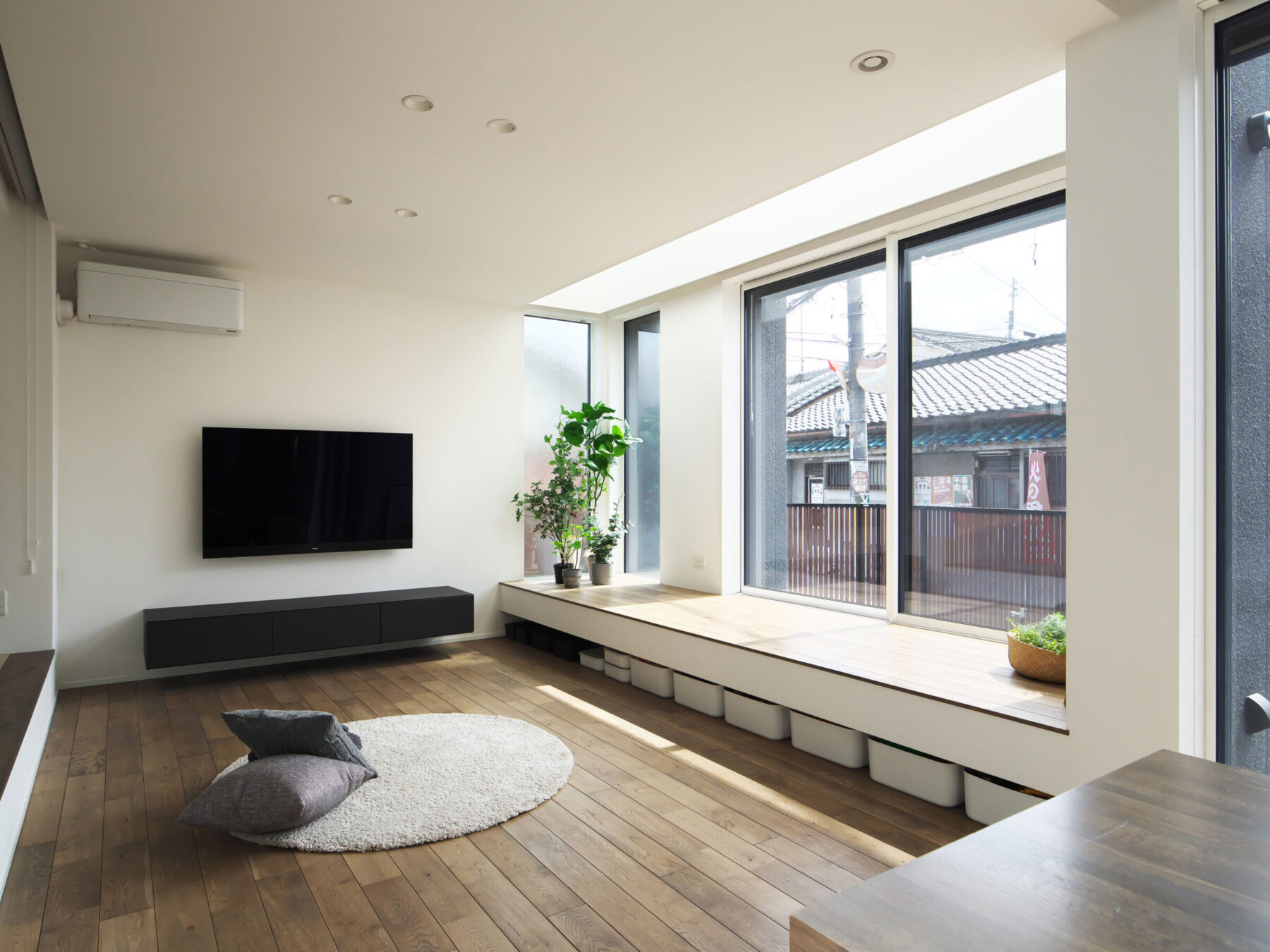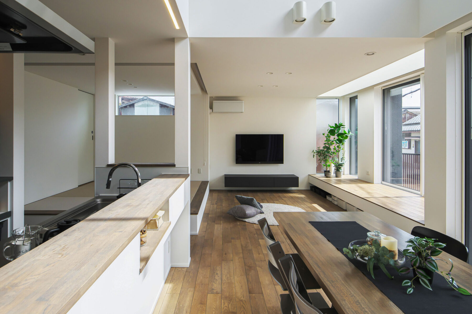 施工事例_町田 窓と一体化したベンチ𓍯 坂牧工務店リビングインテリアリビングデザイン壁掛けテレビ造作本棚造作家具大きな窓のある家窓際ベンチ土間リビングIYs新築一戸建て注文住宅マイホーム計画。