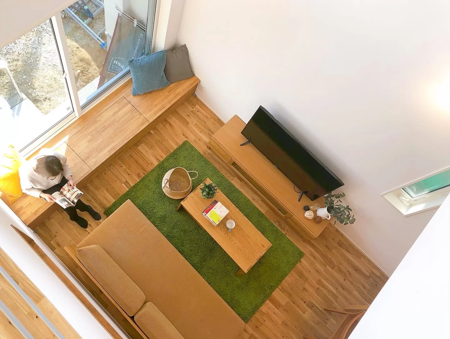 掃き出し窓の前の造作ベンチは様々なことに使えます 自然光を浴びながら本を読んだり、外の景色を眺めながらコーヒータイムにしたり床に座って、デスク代わりにしても良いですね 🏠施工事例更新しています🏠 more⇨@lixil_ls_oogakiLDK勾配天井窓際 ベンチ造作。