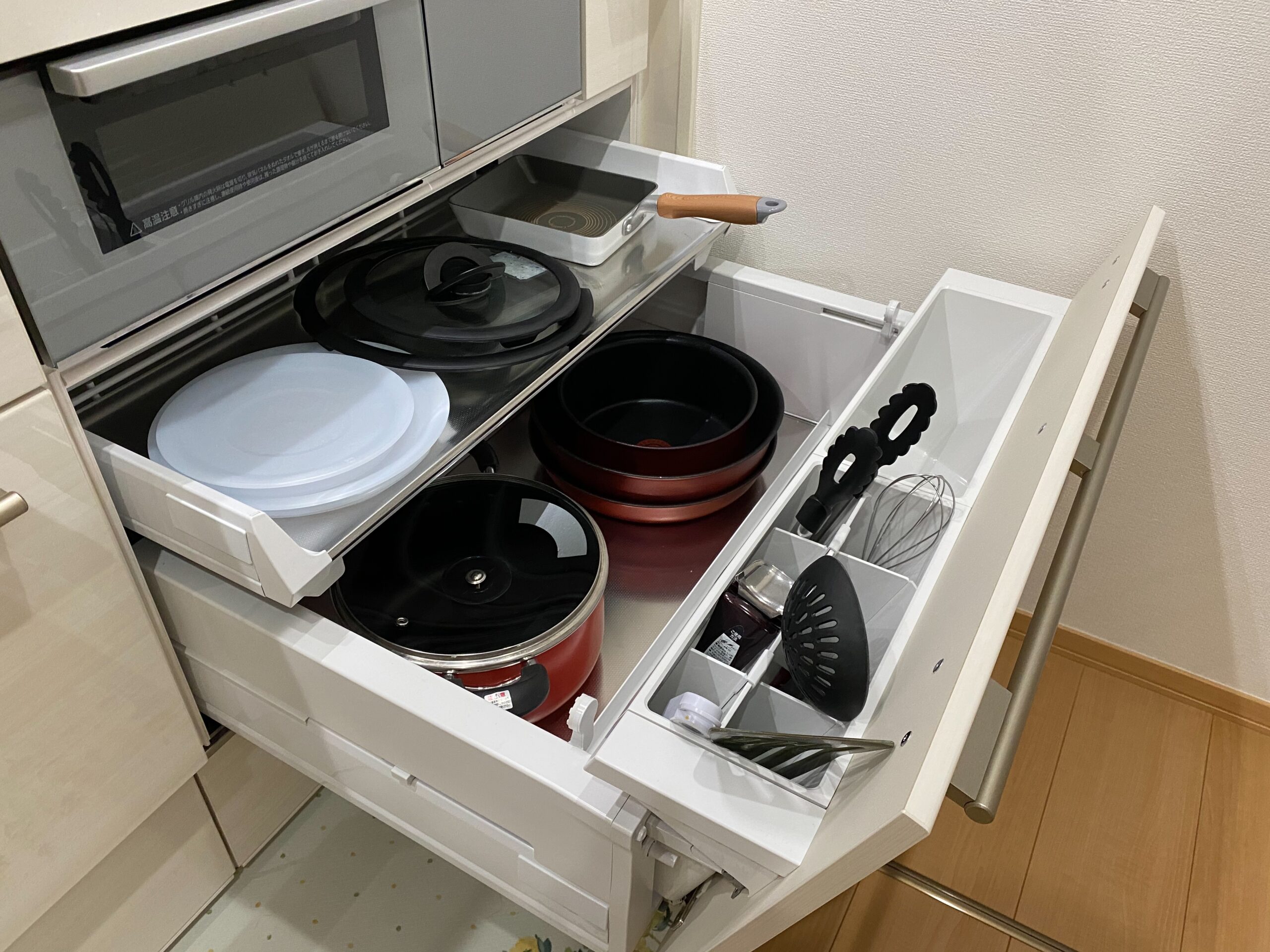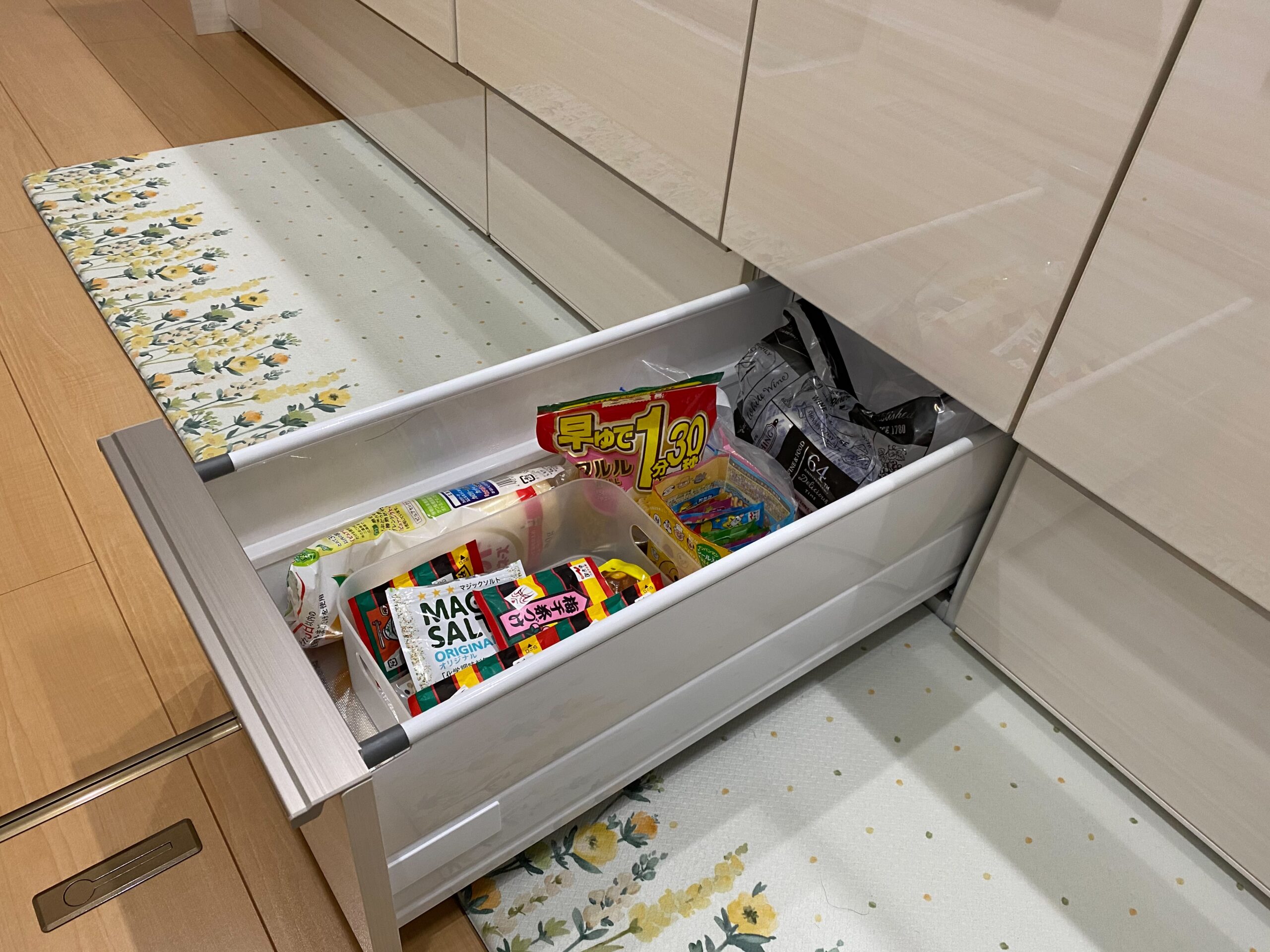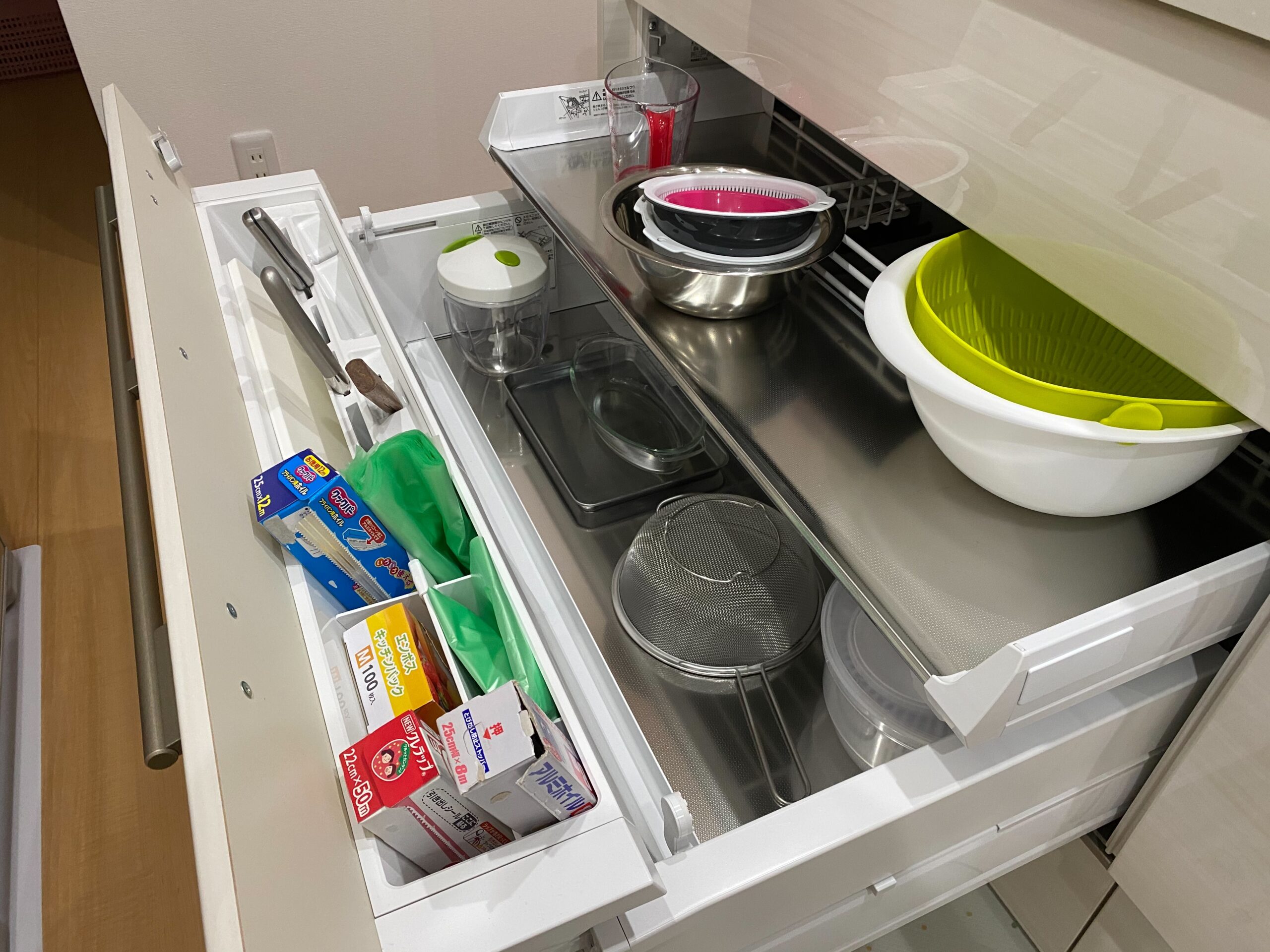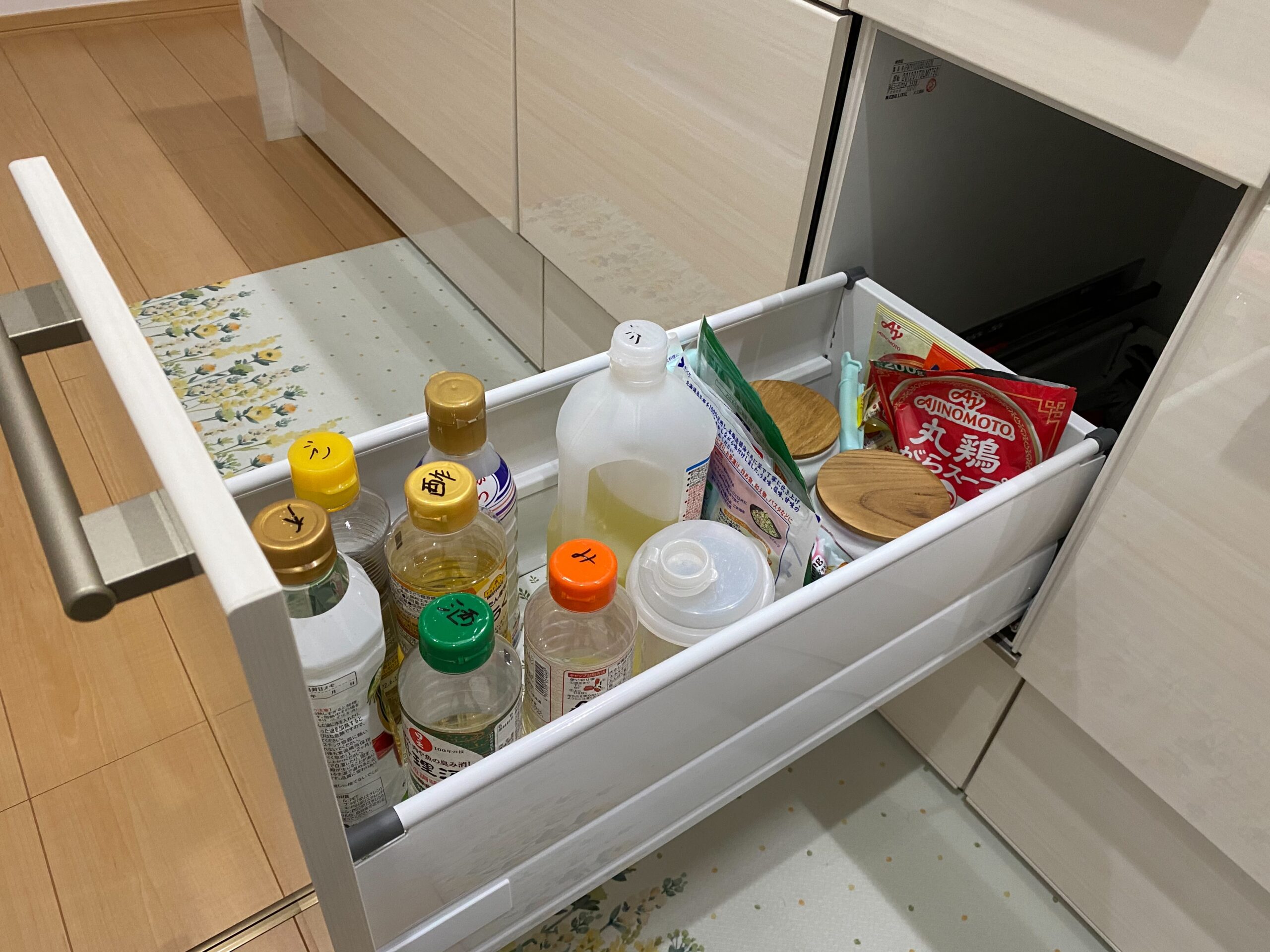 リクシルカップボードの引き出しにシンデレラフィットする収納をブログで紹介中古マンションリノベで快適生活。