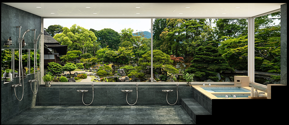 バルコニーとつながるアウトドアバスの様なバスルーム高級バスルームBAINCOUTURE高級オーダーメイドバスルームブランド。