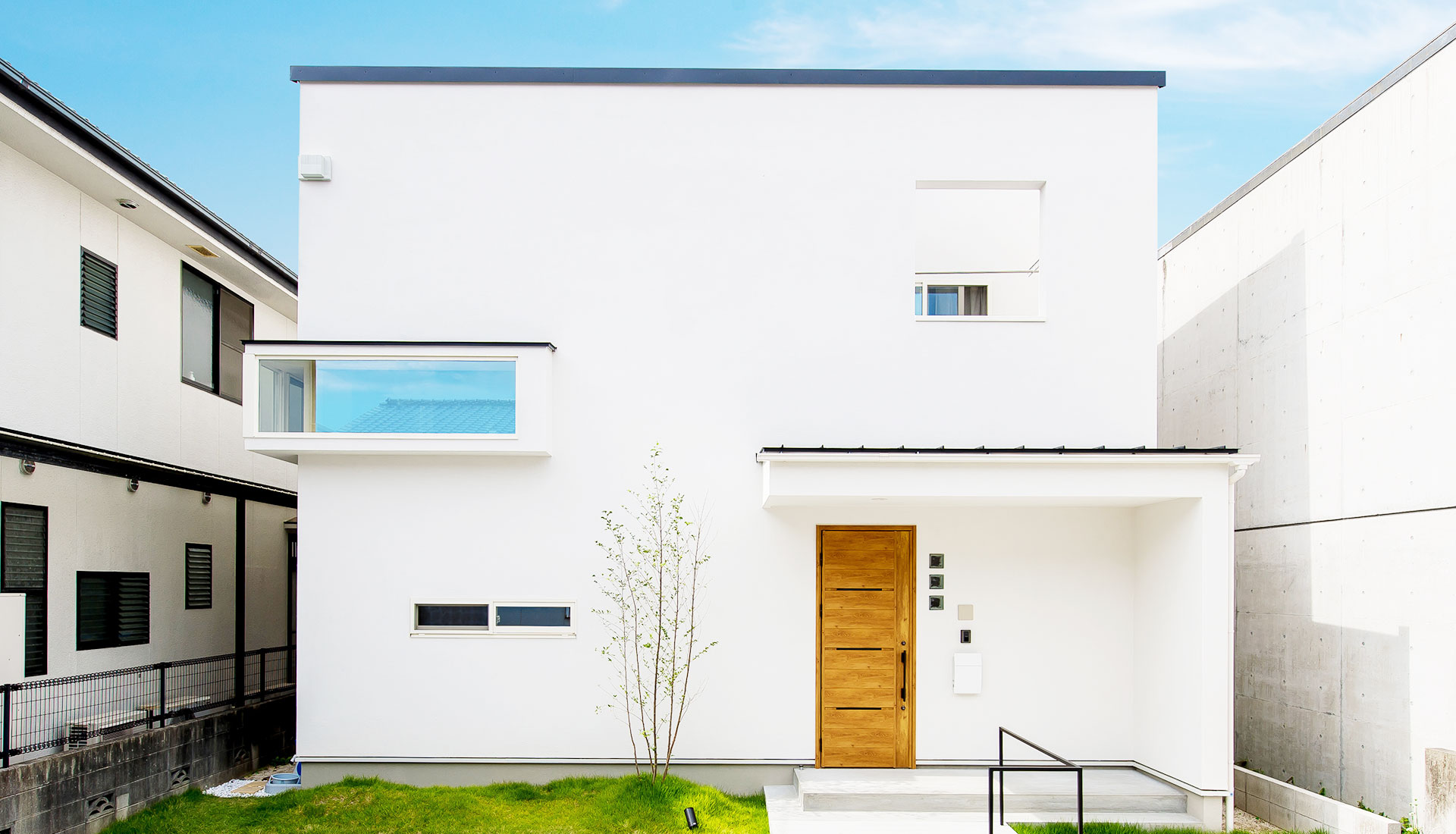 ホワイトの外観に木がアクセントのナチュラルな四角い家、注文住宅Simple Box注文住宅施工事例福岡・久留米の注文住宅会社ホームラボ。