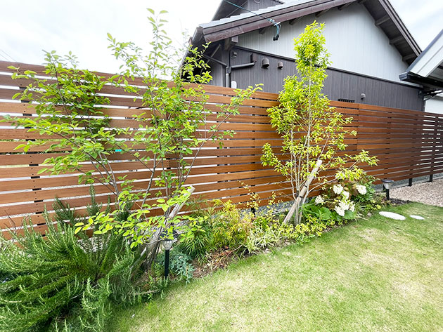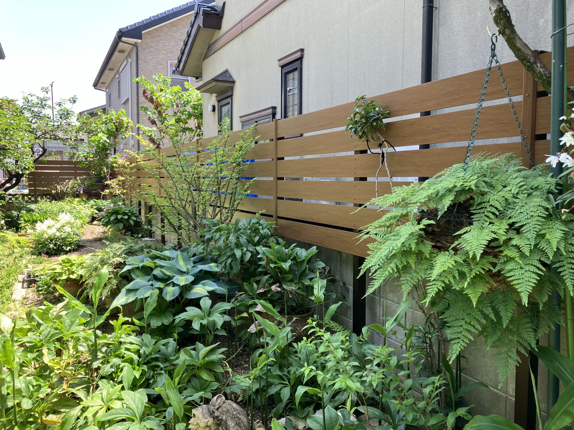 道路からの目隠しを担う、木目が魅力のウッドフェンス-鎌ヶ谷市F様邸お庭の目隠し施工例,ウッドフェンス 木製 の施工例千葉県 東京都の造園植栽 庭施工造園業専門店 新美園。