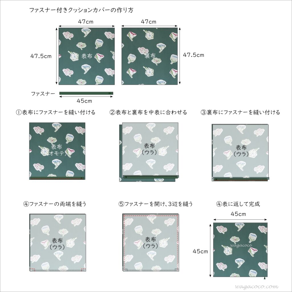 作り方 ファスナー付きクッションカバー 縦長一枚の生地で作る45×45cmわが家のここち。