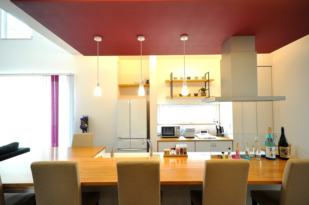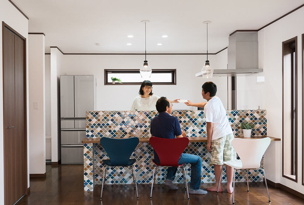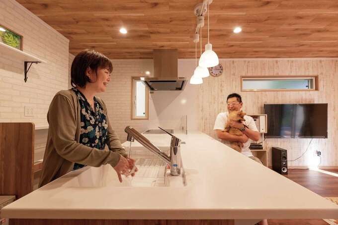 ダイニングテーブルを置かない代わりに、奥行きのあるカウンターキッチンで食事を楽しむ くふうイエタテ。