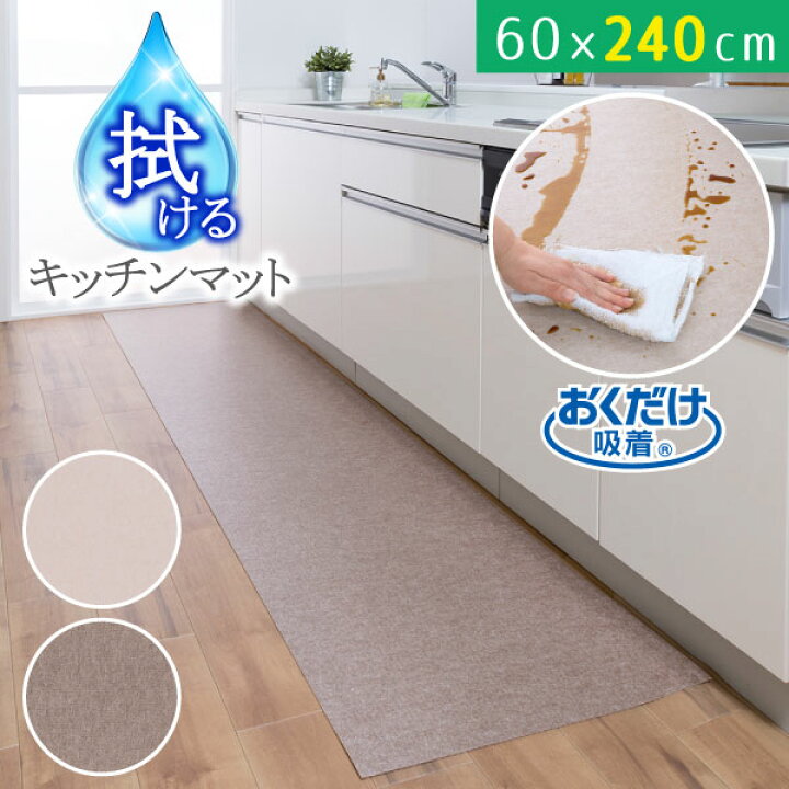 吸着拭けるキッチンマット 60×240cm 無地送料無料おくだけ 吸着 ズレない バリアフリー マット 滑り止め 撥水 加工 薄い ペットカット シンプル キッチン 台所 拭ける 拭くだけ 240cm住マイル。