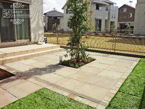 千葉県流山市 リフォーム庭工事 シンプル タイルテラス 自然石 シンボルツリ。