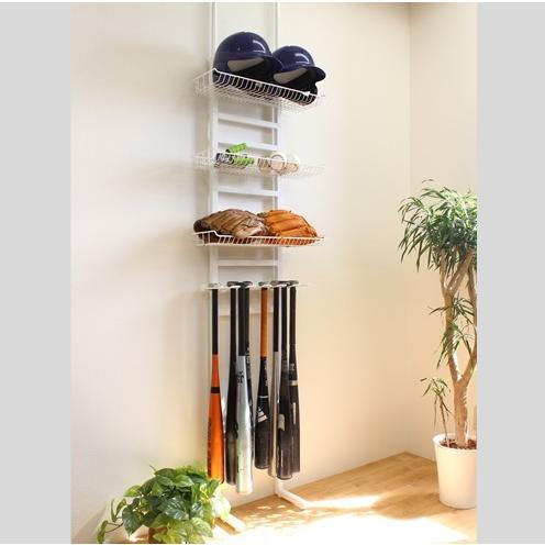 野球道具 突っ張り ラック 白 バットスタンド 玄関収納 壁面 スチール グローブ 野球 ソフトボール ネット。