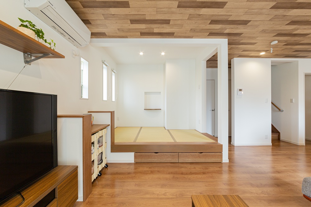 和風二世帯注文住宅の和室リビングの既存神棚再利用壁面収納造作設計北島建築設計事務所。