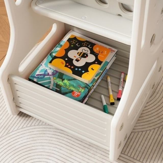 絵本棚 絵本ラック 椅子付き 組立式 大容量 本棚 収納ケース お絵描き おえかき ホワイトボード付き 学習 読書 デスク おもちゃ箱 おもちゃ収納ボックス キッズ 子供 収納棚 トイボックス 子供部屋 コンパクト 小物収納 かわいい 片付けが身につく知育家具 インテリア。