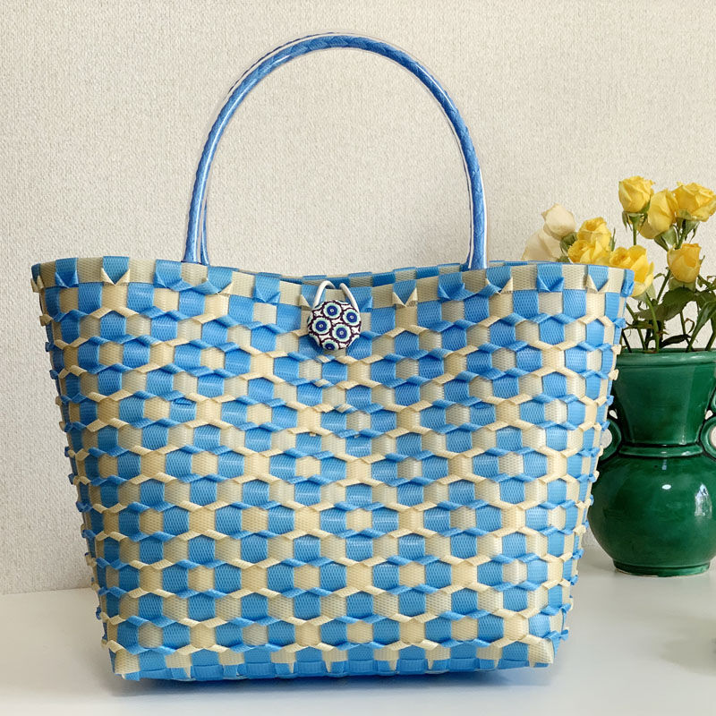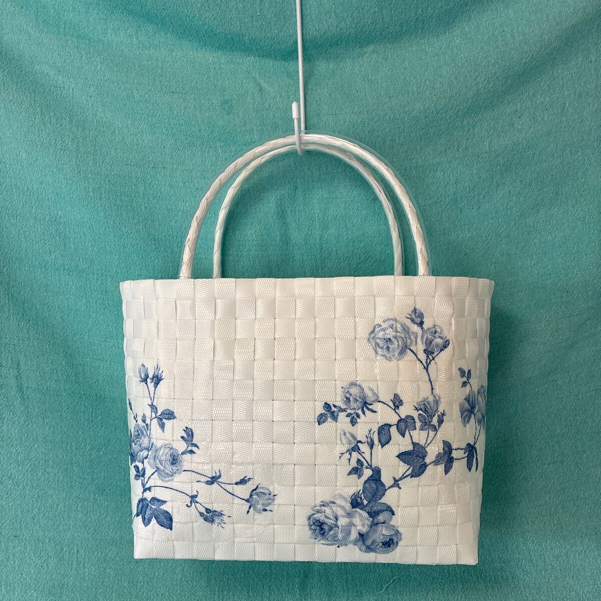 PPバンド プラカゴバッグ 花模様 ホワイト ブルー 雨でも平気な ppバンドの かご。