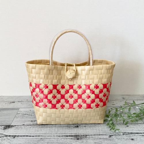 プラかごバッグ プラカゴ PPバンド ハンドメイド 花柄 赤 レッド ベージュ。