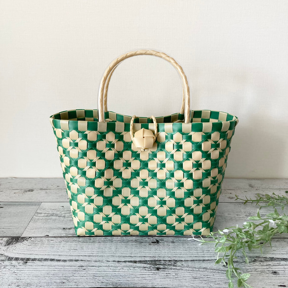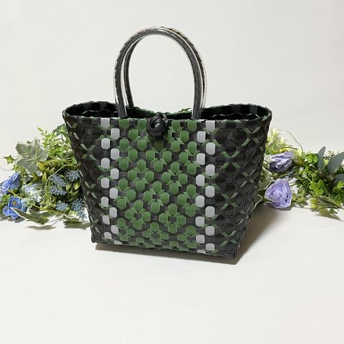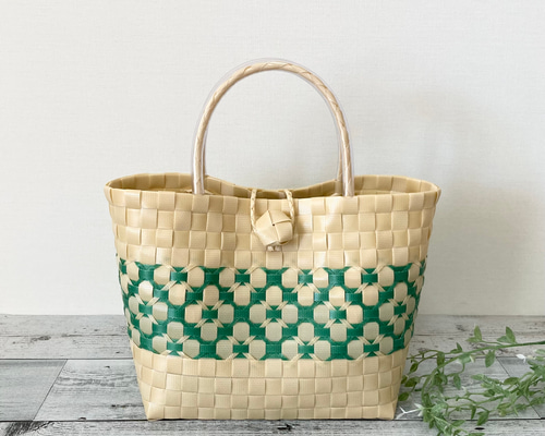 プラかごバッグ Mサイズ 花柄 グリーン×クリーム プラカゴ ppバンドバッグ ppバンド プラかご かごバッグ kanamorimonaka 通販14919738Creema クリーマ。