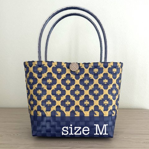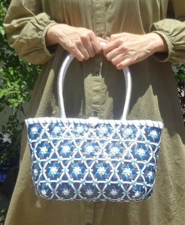 プラかごバッグ プラカゴ PPバンド ハンドメイド 群青 白 ホワイト プラカゴ 花まる編み 六つ目華編み紺色×白 PPバンド かごバッグ 花柄- yiki's GALLERYminne byGMOペパボ 国内最大級のハンドメイド・手作り通販サイト。