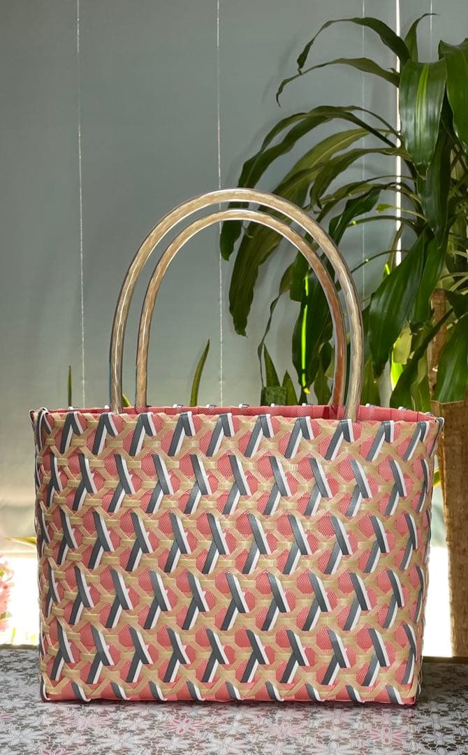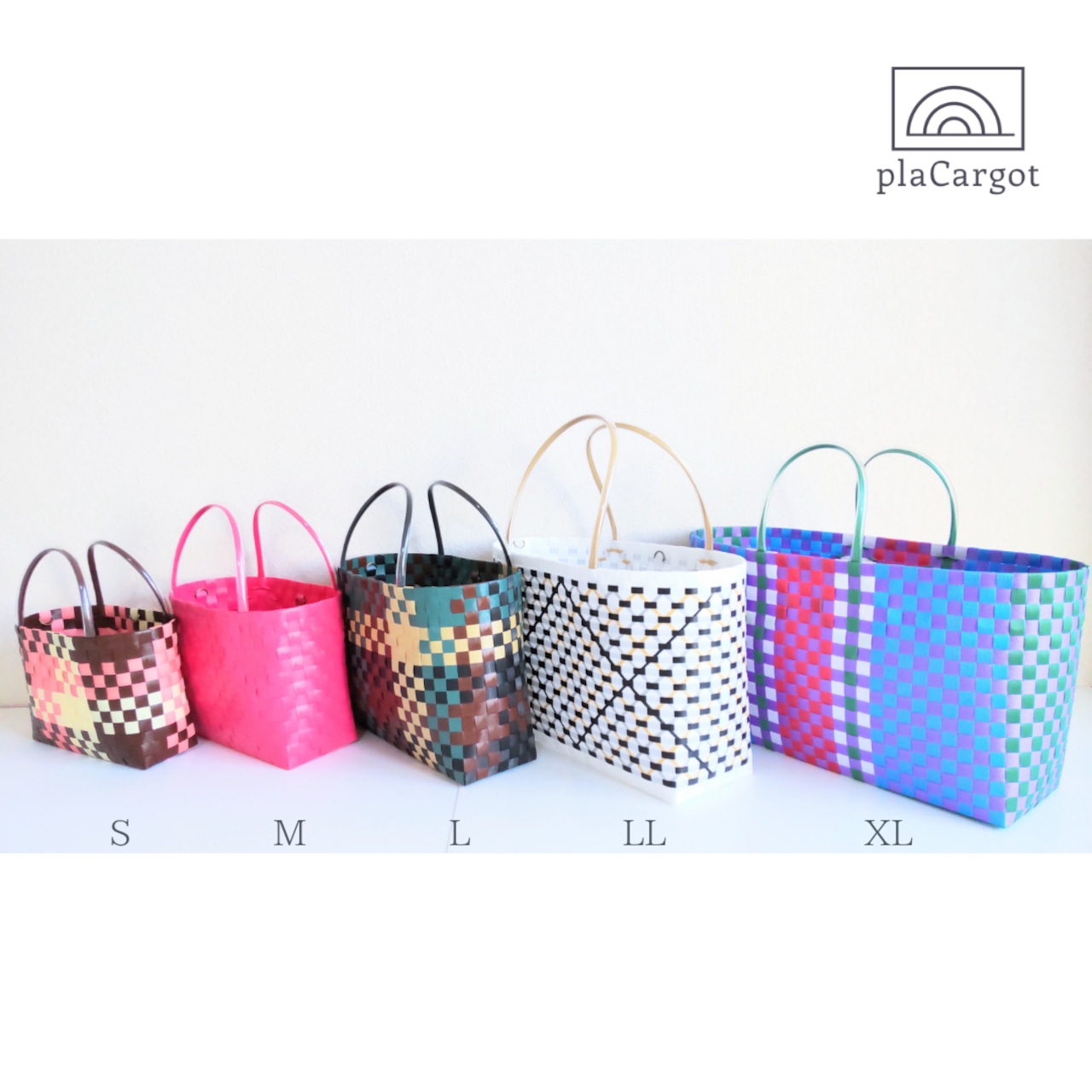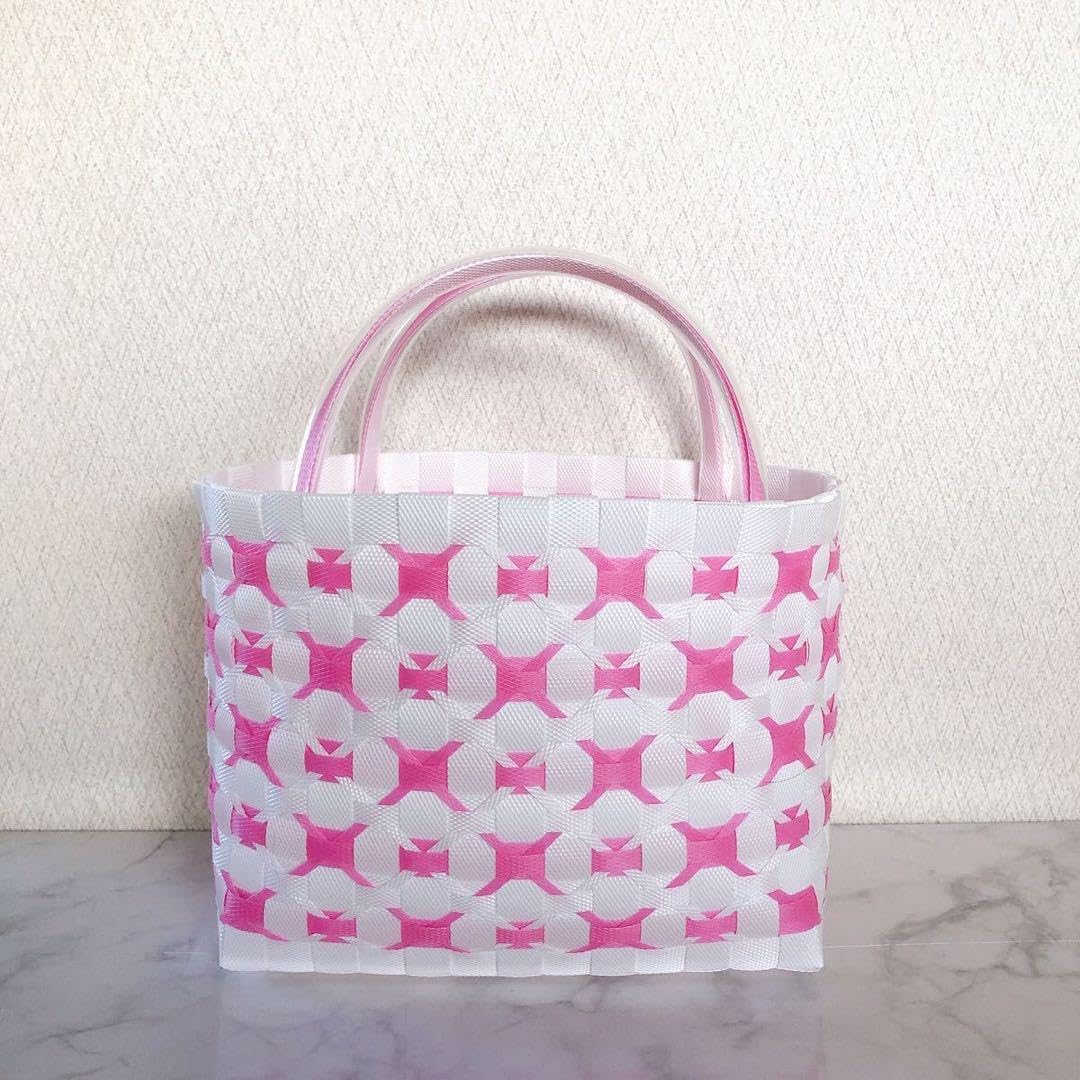 プラカゴバッグ 大きめサイズ ピンク プラカゴ 花柄 ツートン ミニサイズ ピンクx白 バスケット エコ。