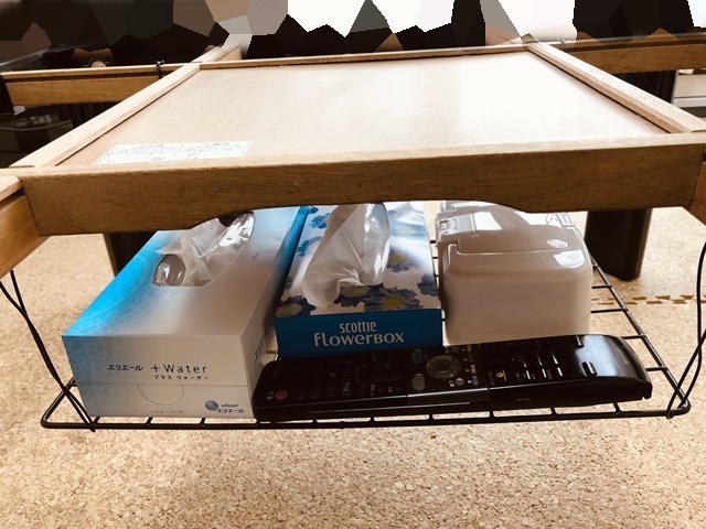 机の下に収納をDIY!ティッシュやリモコンがスッキリ取りやすい。