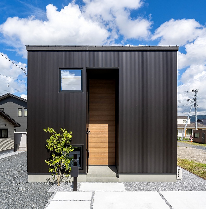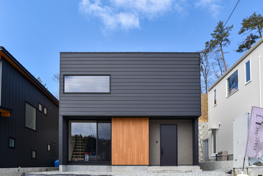 山梨県昭和町新築注文住宅黒ガルバの家。木目が外観アクセントに。