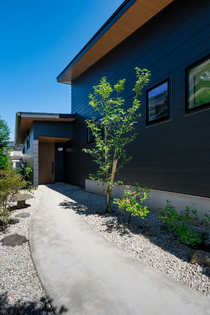 黒い乱形石のアプローチ。シンプルな外溝 三原・尾道・竹原で新築・注文住宅・住まいの事ならCraft Arc谷前住建:三原・尾道で新築・注文住宅なら。