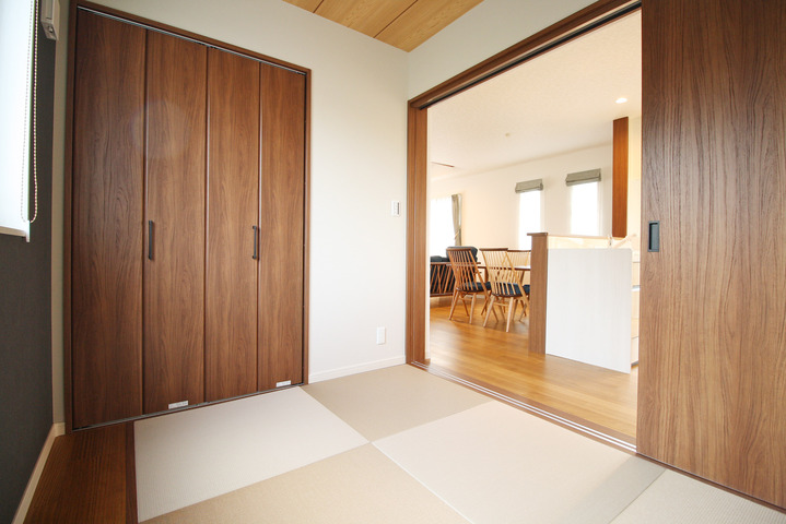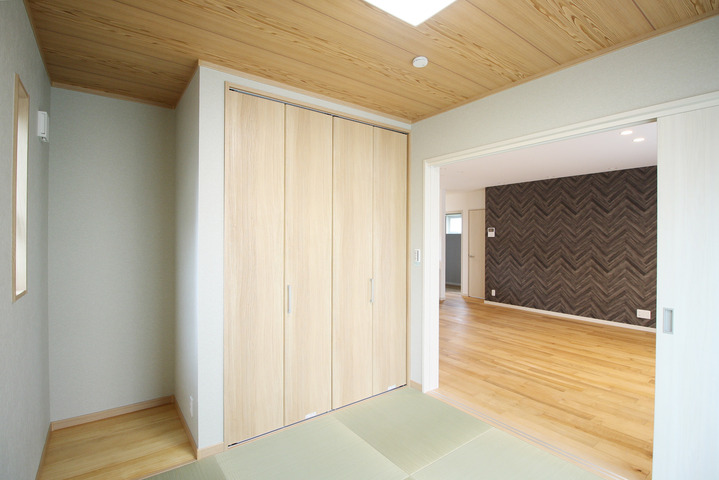 法事などで親族が集まることもあるため、玄関を入ってすぐの場所に和室を配置。アクセントクロスや木目の天井でモダンな雰囲気に仕上げた くふうイエ。