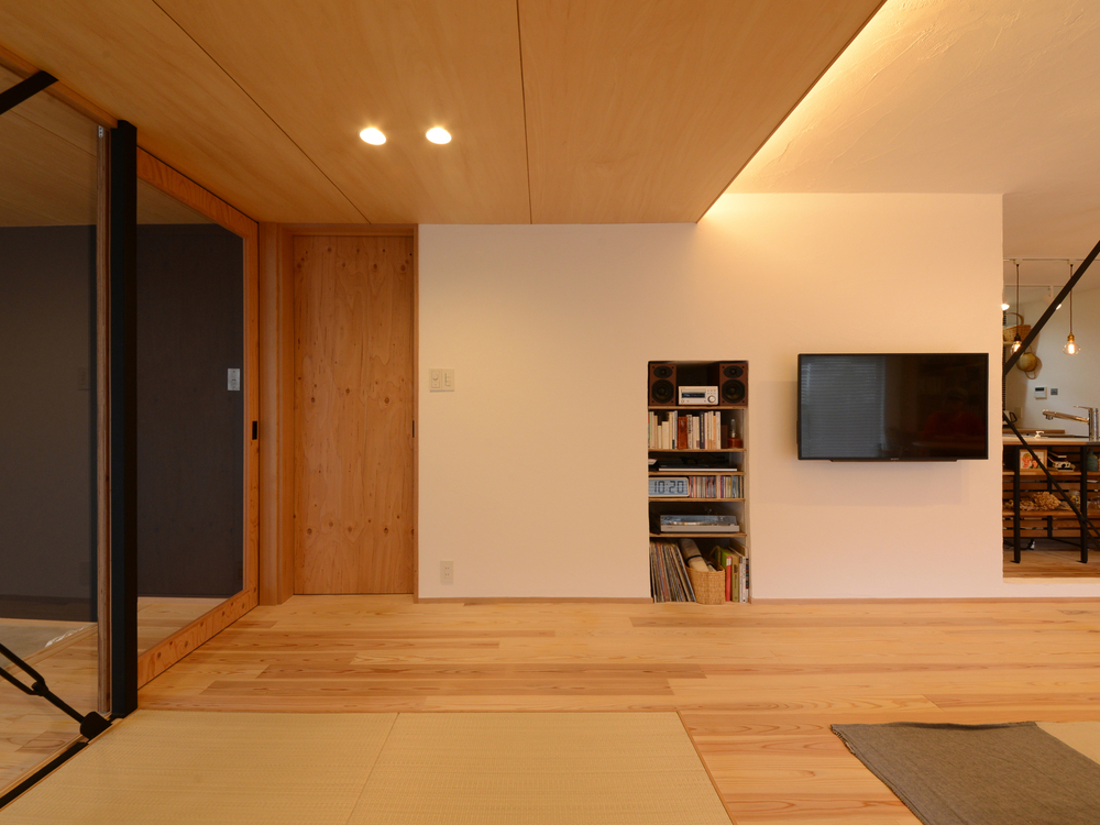 和室と一体化した木目調の温かみある板張りの折上げ天井のLDK - 事例写真「和の趣、やわらかな空間がここちいい家」注文住宅のハウスネットギャラリ。