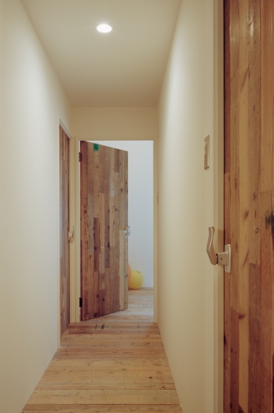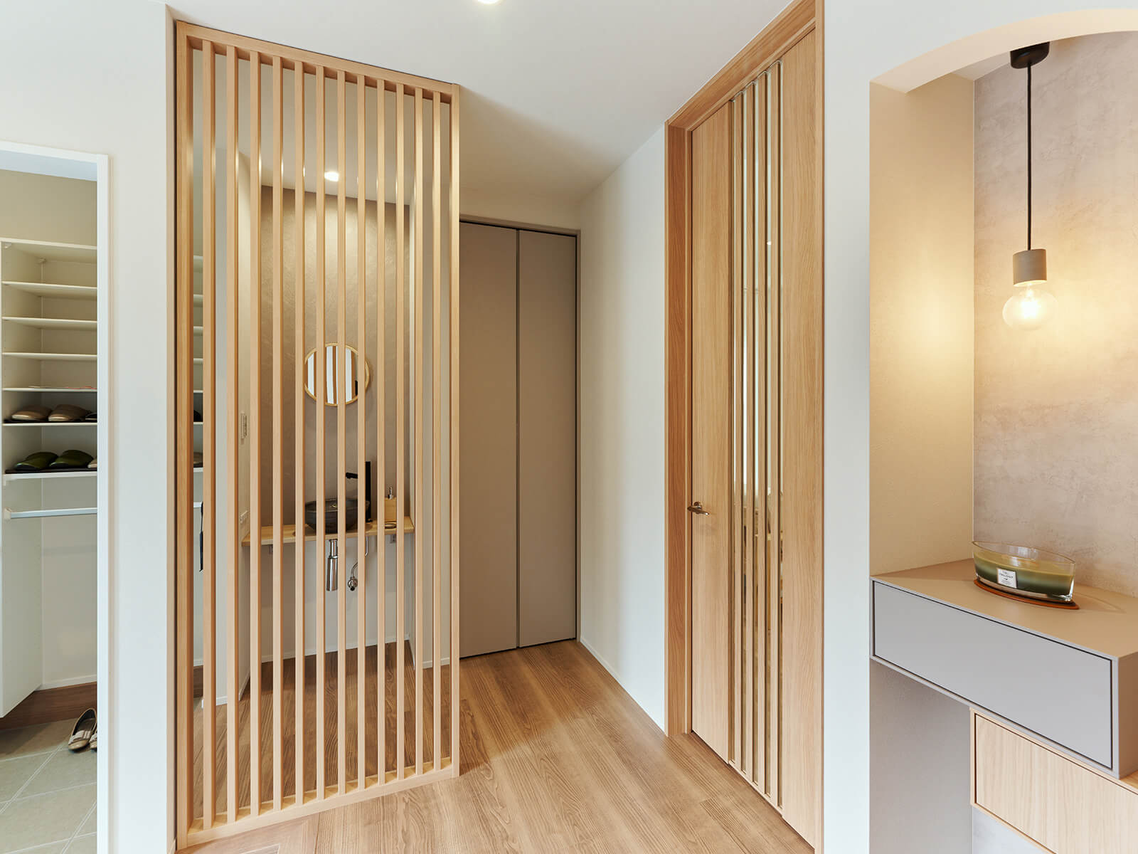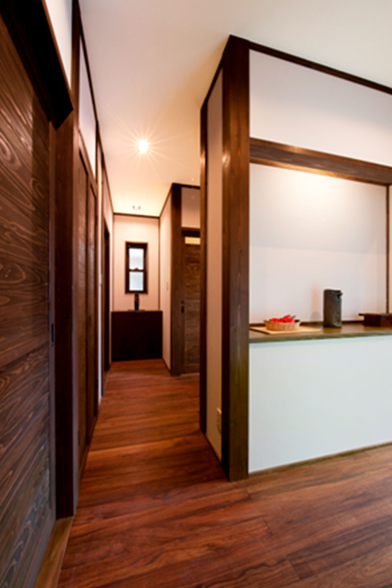 玄関を抜けると右手にリビング、左手に水廻りが配置された、すべて造作ドアで統一された和風の廊下 -事例写真「城下町を彩る古民家風住宅」注文住宅のハウスネットギャラリ。