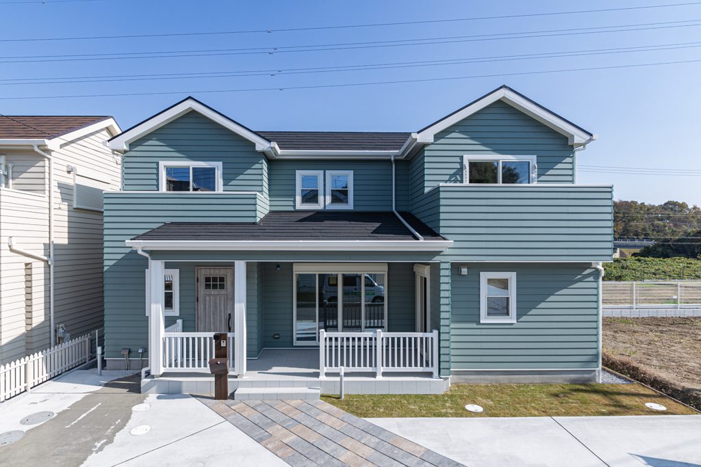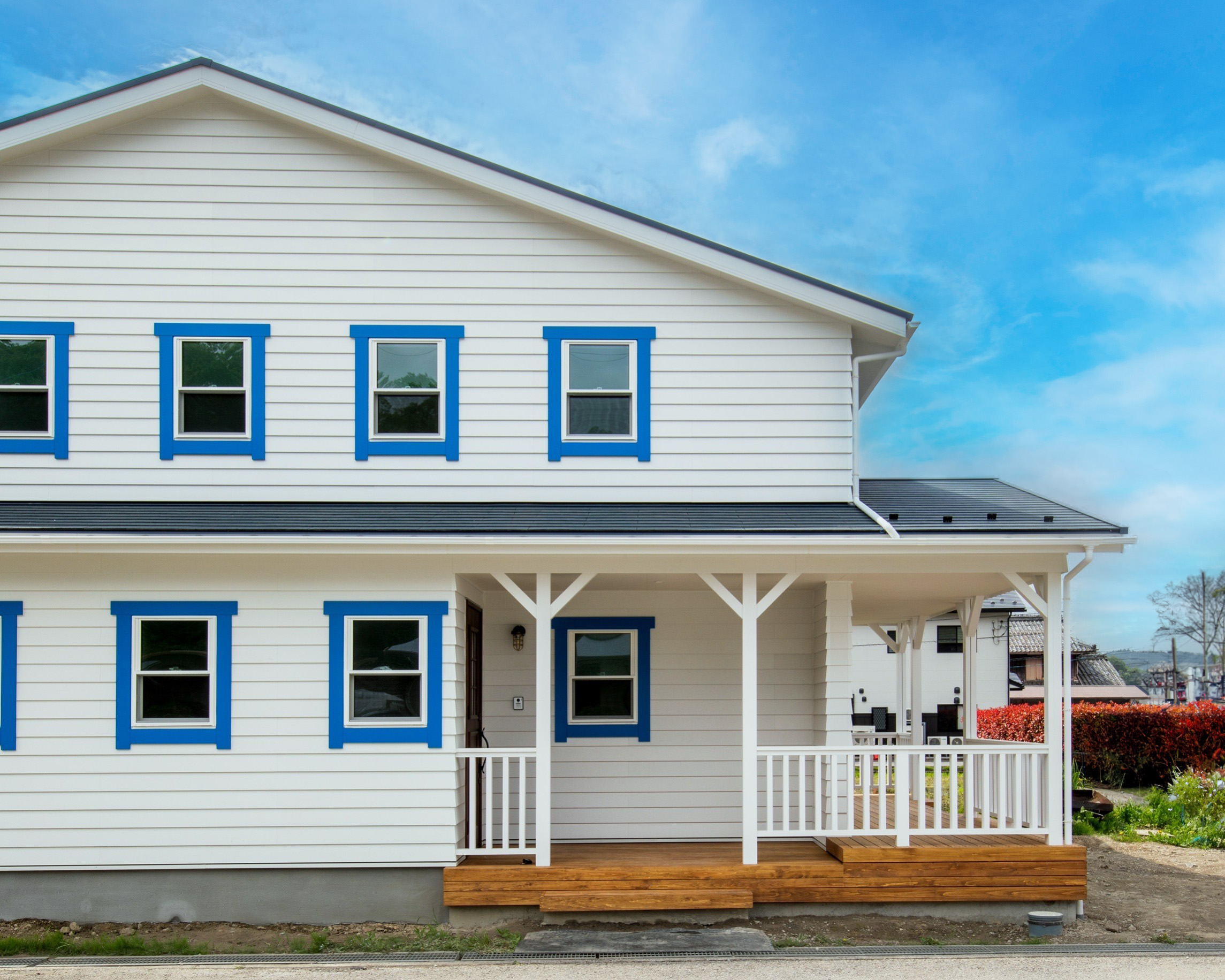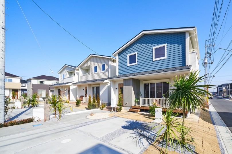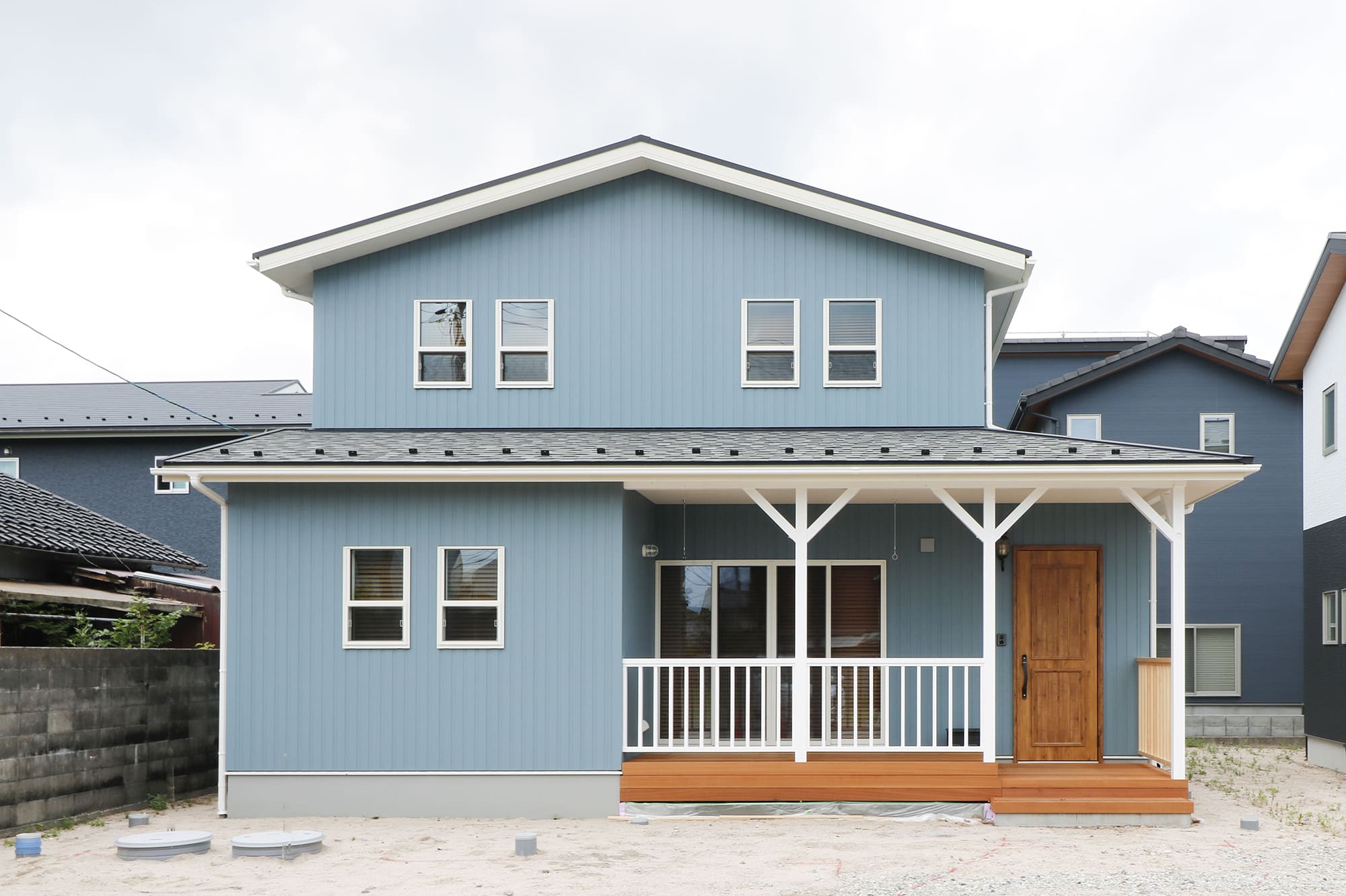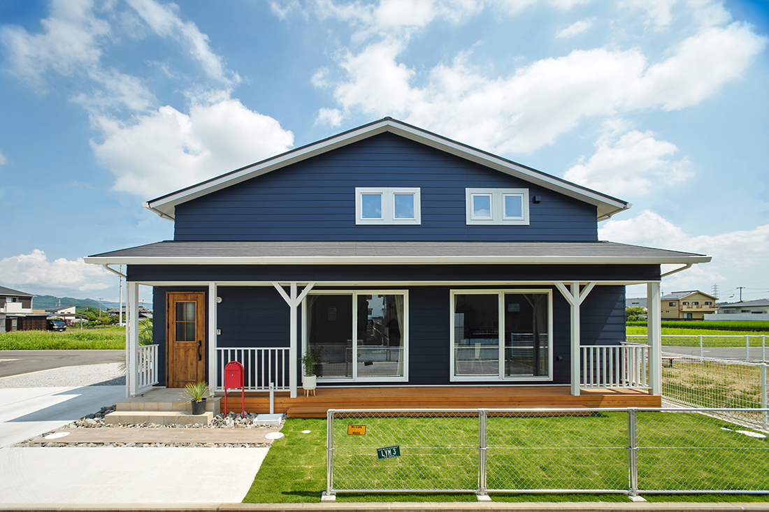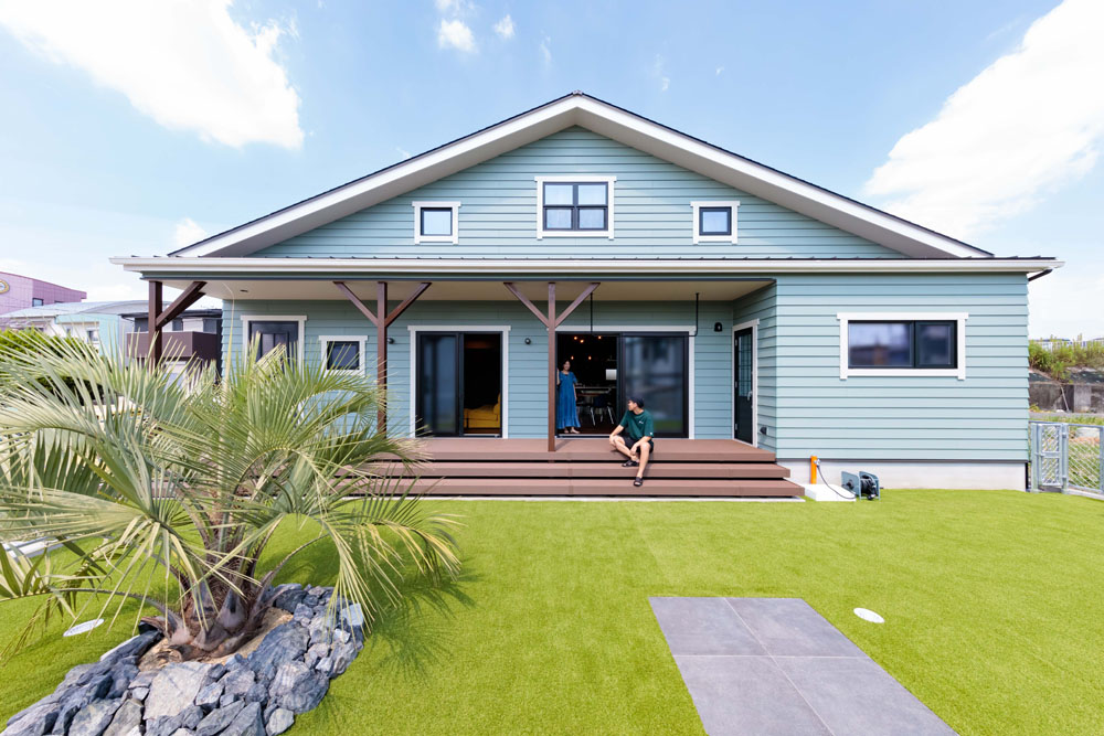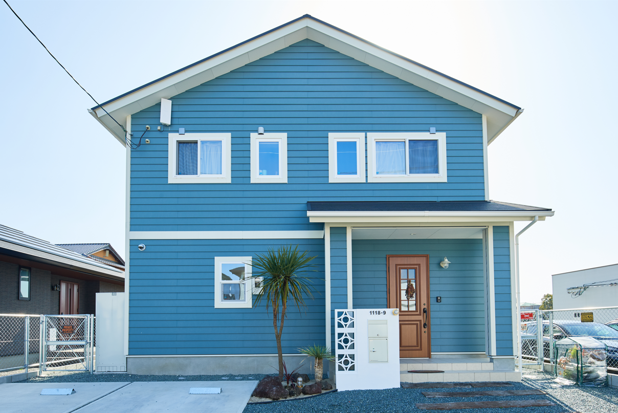 鮮やかなブルーの外壁が目を引くカリフォルニアスタイルの家熊本・静岡の住まいづくりの出発店ans アンズ専属アドバイザーがサポート。