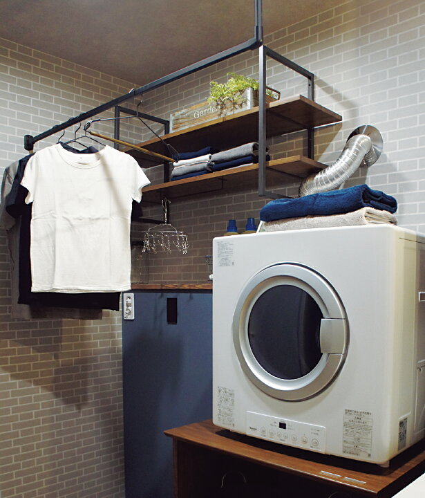 アイアンの物干しと、ランドリースペースの収納,ランドリールームランドリー収納室内物干しアイアン物干し物干しバー室内干しアイアンバ。