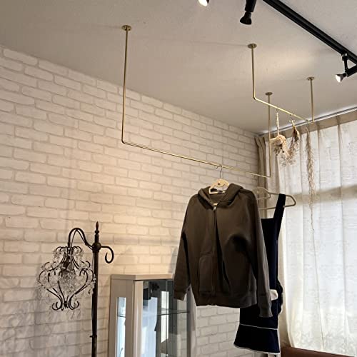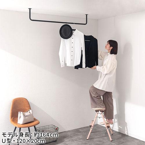 ハンガーバー 吊り下げ アイアンバー 物干し ポールハンガー 部屋干し 室内物干し 天井付け スリム 幅60 高さ20 コの字 U型 おしゃれ 黒 白ゴールド。