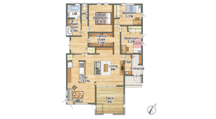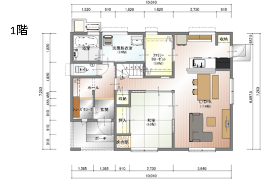 4人家族4LDK 1階にファミリークローゼットのある住みごこちのいい家大川市の工務店で平屋・二階建て注文住宅を建てるならメイクハウス:柳川市。