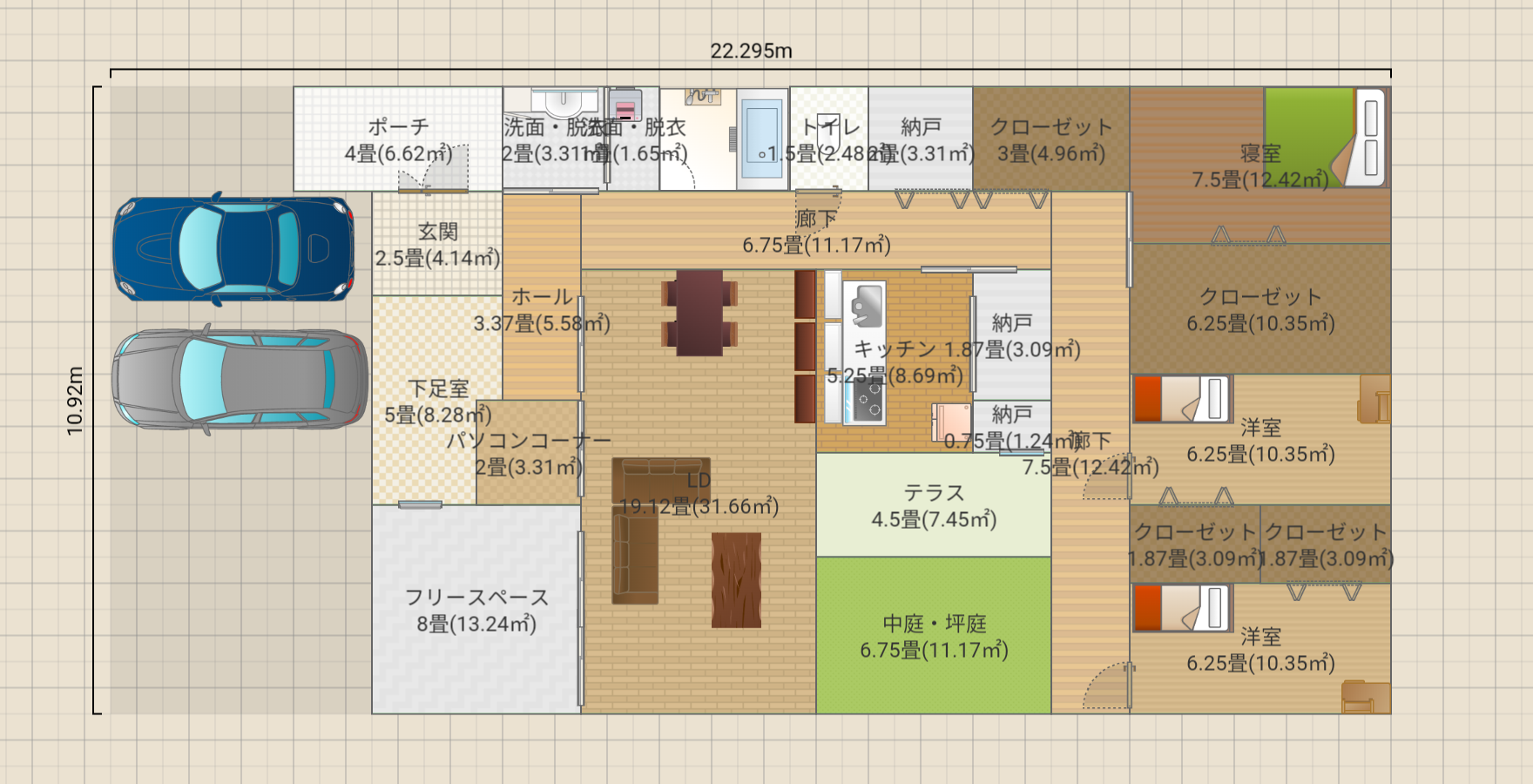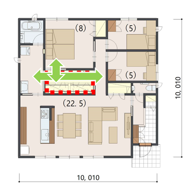 コスパ良い間取りを作るには 優先順位の低い廊下から減らすのが王道です。 何かの空間を廊下代わりにできないか? と考えるのがコツです。LDKや洗面室やファミクロは 廊下の機能を含んでいるので上手く使いたいですね。