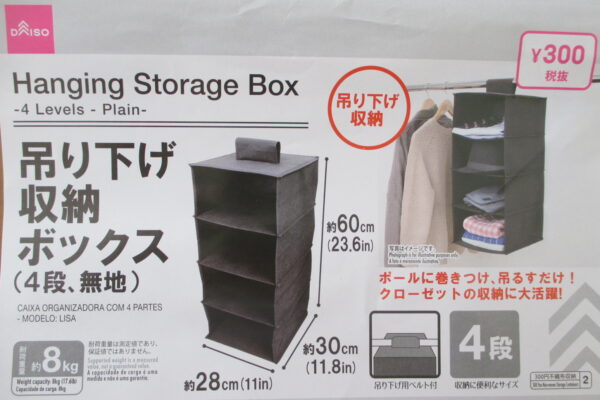 DAISO ダイソー 吊り下げ収納ボックス 4段、無地およげ100円。