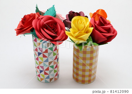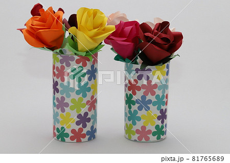折り紙で作った手作りのバラの花を綺麗な花瓶に飾った様子の写真素材81412090- PIXTA。