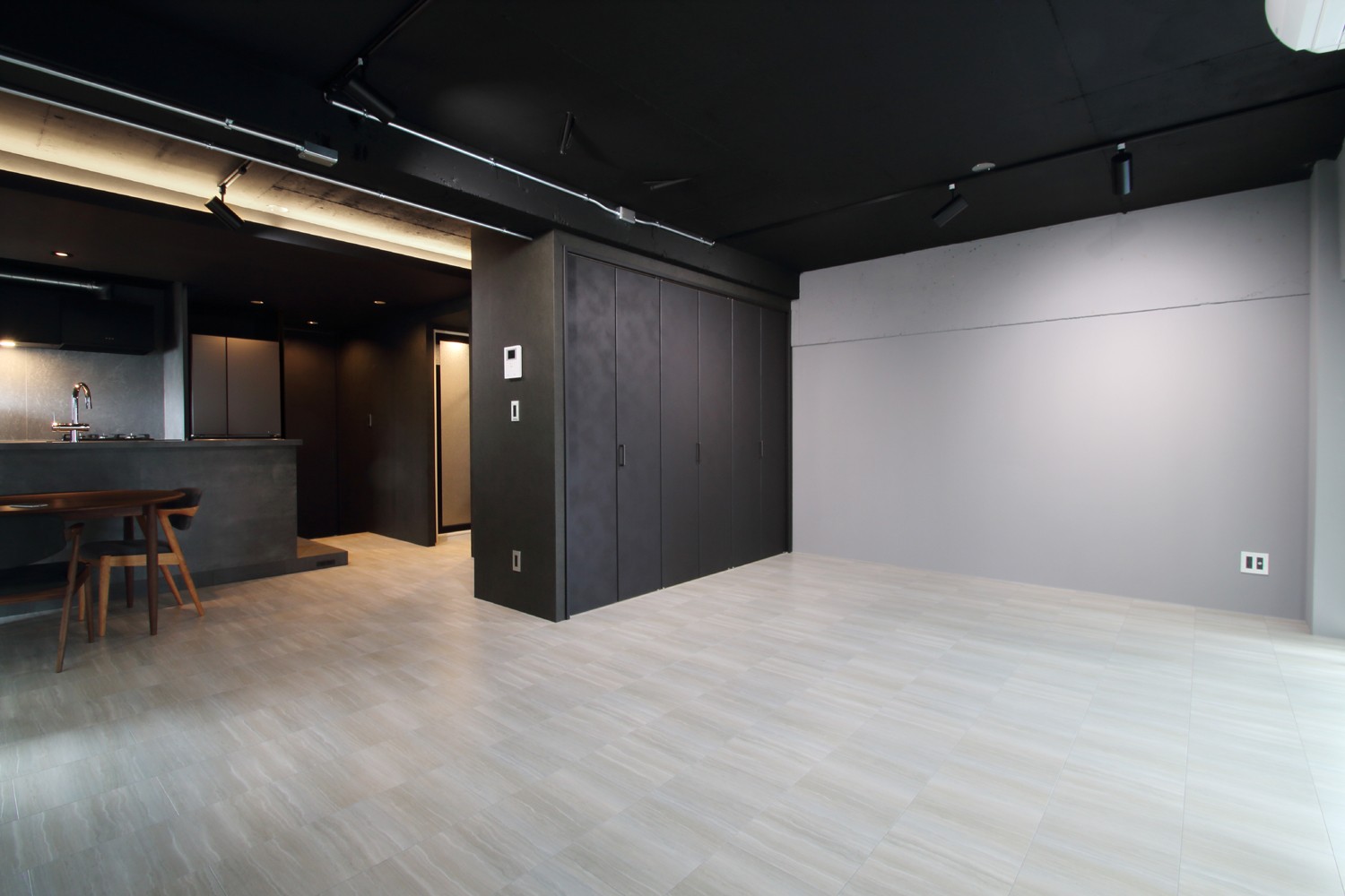 1枚目LDK ダークカラーを基調とした大人かっこいい東京リノベーション- リビングダイニング事例SUVACO スバコ。