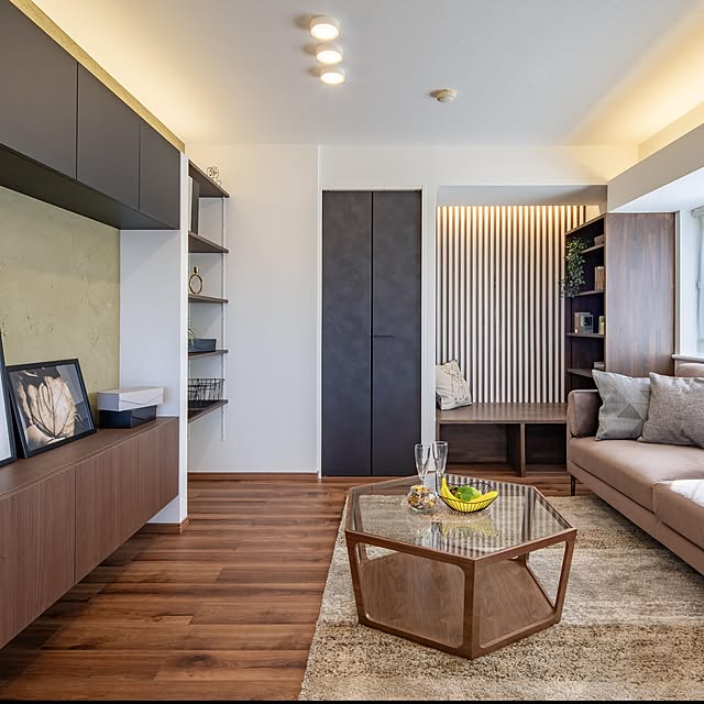 ウォールナットの家具をメインにオーセンティックモダンに☕🍃 くすみブラウンやくすみグリーンを合わせて和の要素をplus🏠空室対策戸建て賃貸マンション家具レンタルおしゃれなインテリアインテリアコーディネートモデルハウスホームステージング。