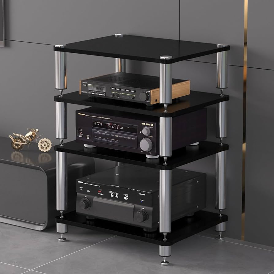 オーディオラック 木製 3 4 5段 キャスター付き AVメディアラック avラック アンプラック CDアンプ機器ラック メディア スタンドプリンタブラケット dvdラック オーディオボード ゲーム機収納ラック 録音室用 家庭用 黒い棚+黒い板 4段高さ85cm。