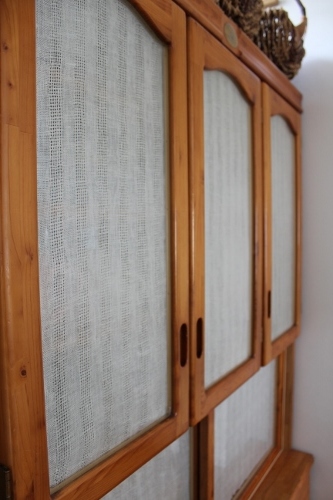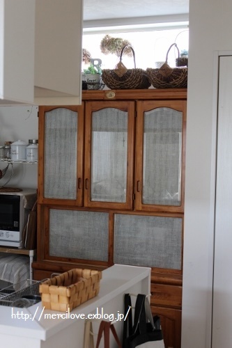大阪発☆収納とインテリア「roseleaf」: ナチュラル感up♪食器棚にダイソーの「手作り布生成はぎれ」で目隠し。