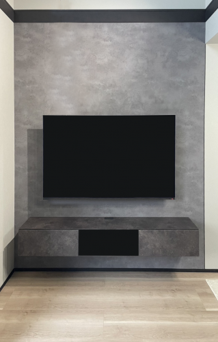 テレビの背面を石目調のブルー・グレー壁紙に張替えました。アクセントクロス張替え専門店。