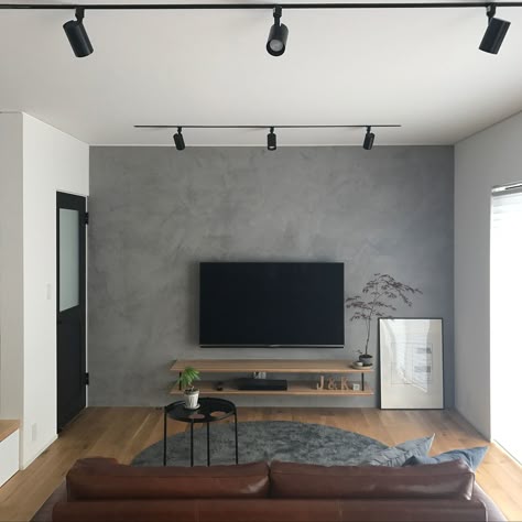 a.o. on Instagram: “. living モルタル風グレーのアクセントクロスに合うパモウナのマットブラックなTVボードと無垢床っぽいikutaのナラ樫がお気に入り* GWに迎えたシェフレラがLDKの空間にめっちゃ合う🌿livingリビングpamounaパモウナtvボード ”。