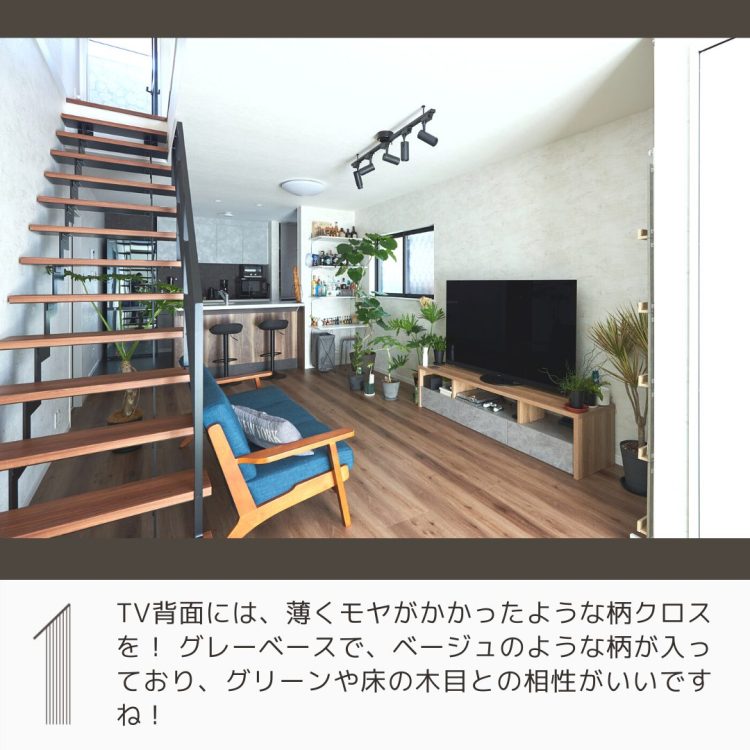 テレビ背面のアクセントクロスが美しいリビング くふうイエタテ。