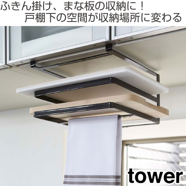 山崎実業 tower 戸棚下まな板&布巾ハンガー タワー4903208024938 タワーシリーズ 収納ラック 戸棚下収納 吊り戸棚下収納吊り下げ収納 まな板受け 吊り下げラック 布巾掛け 布巾ハンガー フキンハンガー キッチン収納ブラック。