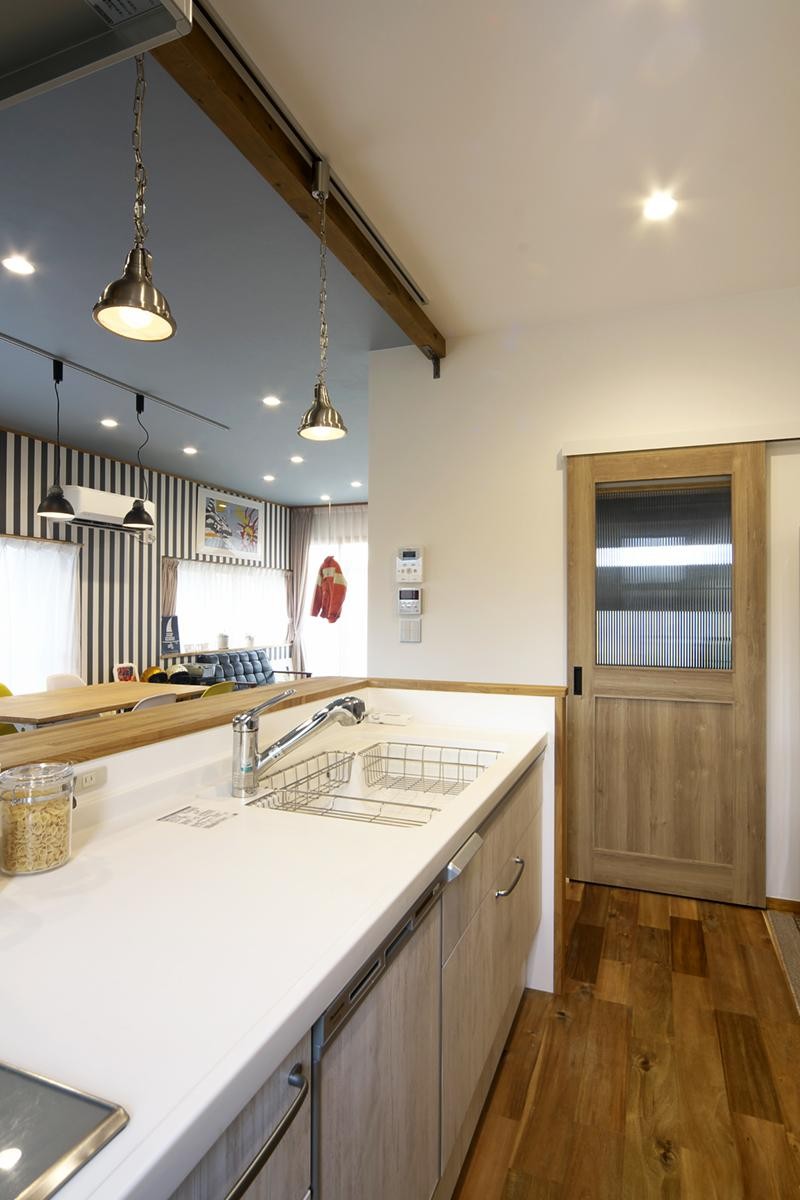 アメリカンレトロスハウス『ダイニングキッチン』 平田タイルのPuddleという特徴的なタイルを施したキッチンは、お施主様のこだわりポイント。落ち着いたグリーンが居心地の良い空間にしてくれます。 照明はHERMOSAで統一。アメリカンレトロなお家を一層引き立てます。