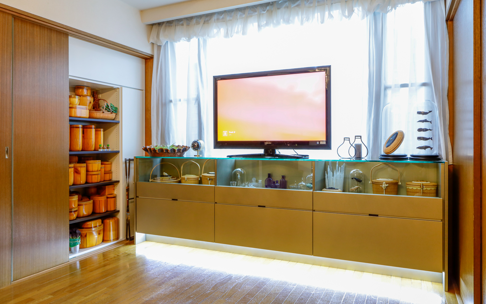 特注塗装パネルとガラス天板で演出したTVボード-東京のオーダー家具・収納の専門店ip20公式サイト。