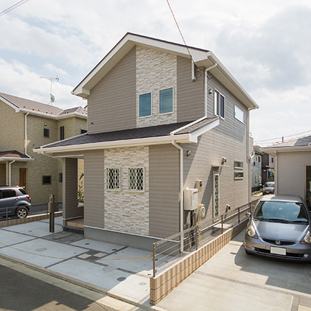木目調グレーを基調に石積調の白を合わせた あたたかみのあるナチュラルモダンな外壁 – 住協建設。