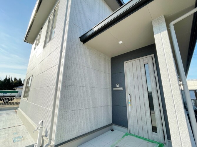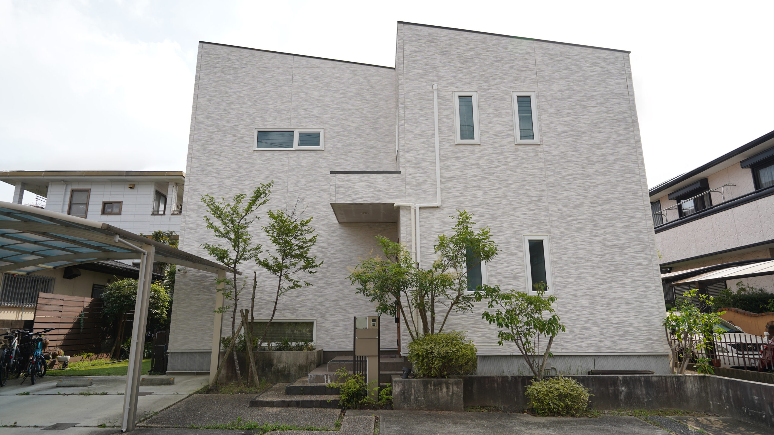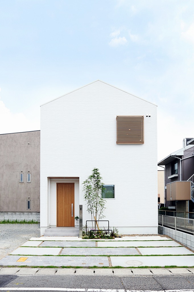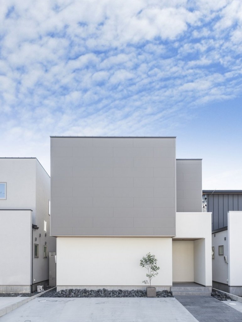 白を基調にグレーをアクセントとした 落ち着きのあるナチュラル&モダンな外観 – 住協建設。