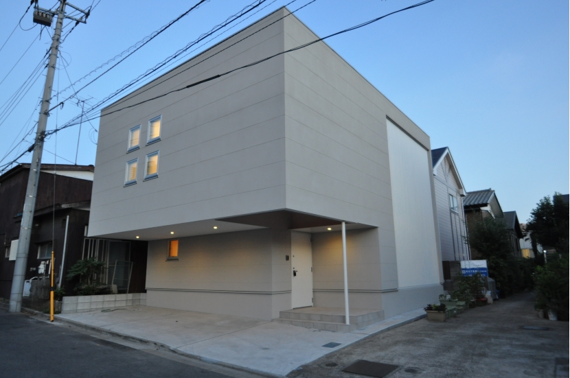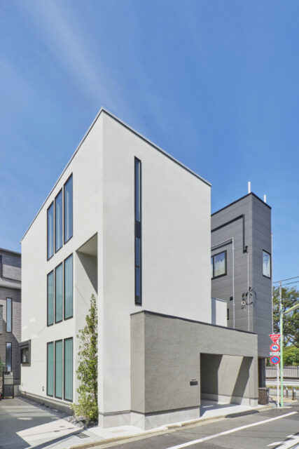 白とグレーを使用したツートンカラーの スタイリッシュな外観 – 住協建設。