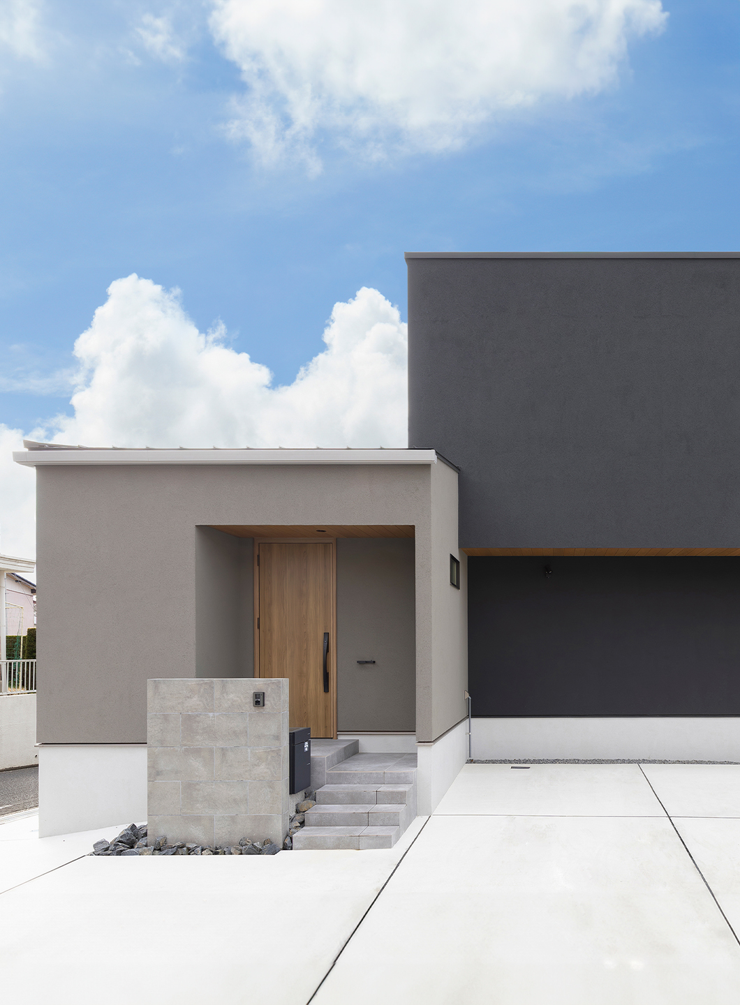 タイルの外壁をグレー系でまとめ、玄関ドアやベランダにはウッド系を使用。落ち着いた中にも木のぬくもりを感じられるやさしい外観に仕上がった くふ。