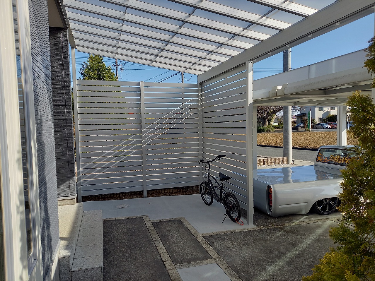 玄関から車まで濡れずに行ける玄関の雨よけ&目隠し&カーポートまで一体化したようにすっきりおしゃれにリフォームプラスG犬山市外構・エクステリア・造園は庭づくり専門店 愛知県扶桑町 池之上造園へ カーポート。