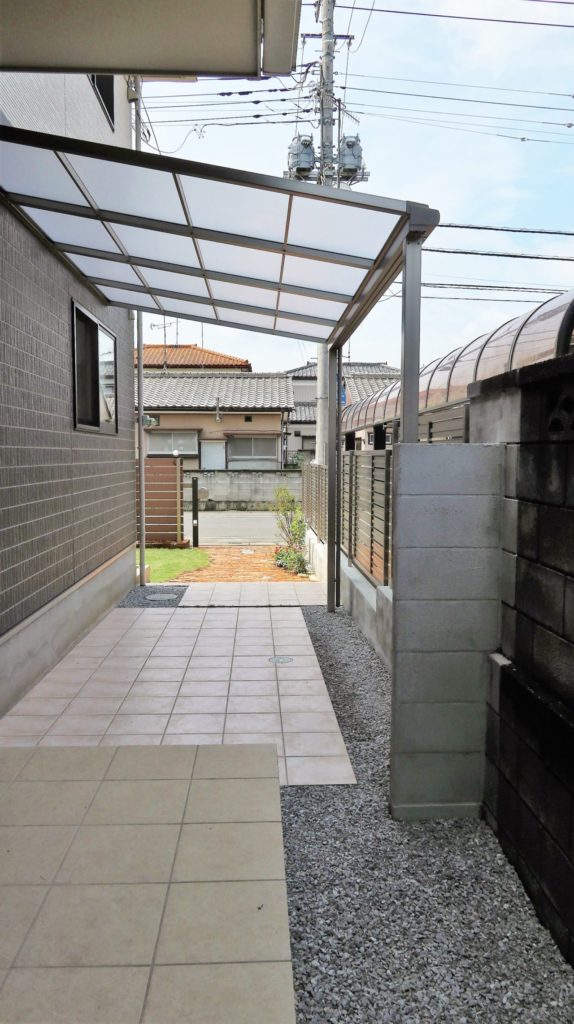 カーポートとテラス屋根を組み合わせて玄関までの動線を確保 彦根市京阪グリーン滋賀・京都・大阪のエクステリア・ガーデン・外構工事。