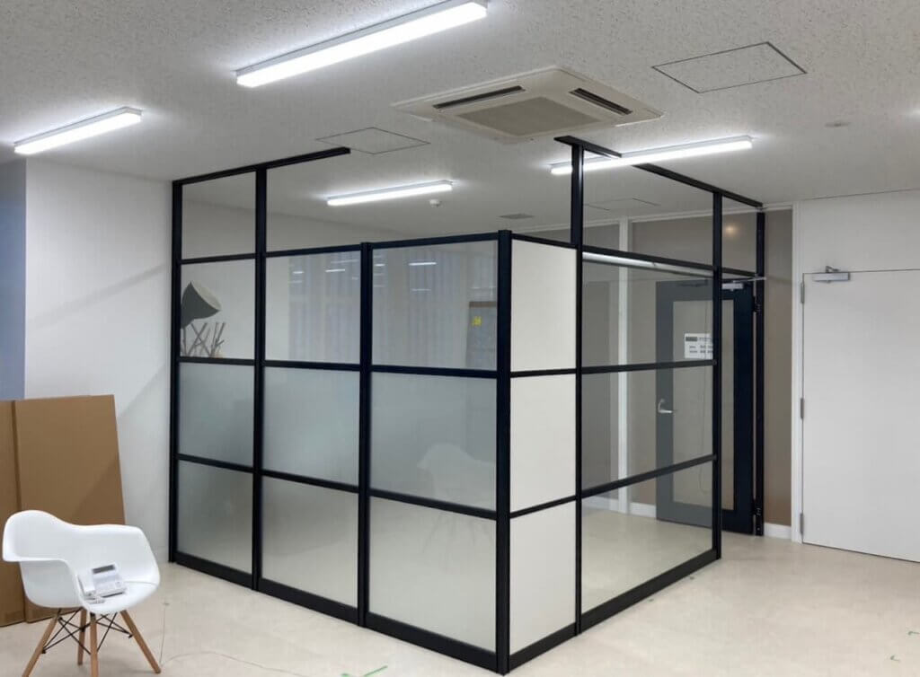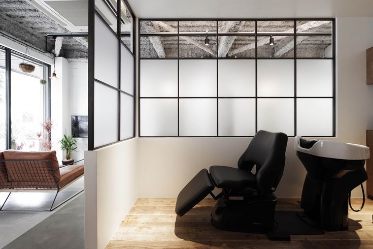 パーティション工事事例美容室の半個室の間仕切り美容院 美容室・サロン系店舗でも映えるブラックのスタイリッシュな亜アルミフレームに目隠しのカスミタイプのガラスパーテーションです。 ↓https:www.partition-lab.jp products varie美容室。
