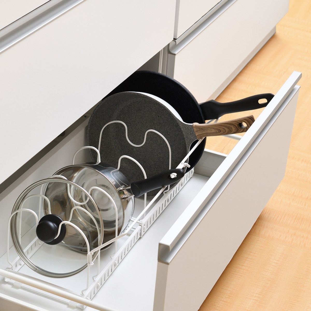 シンク下 伸縮鍋蓋&フライパンスタンド ホワイト フライパンスタンド 調理器具 鍋蓋 収納 引き出し フライパン収納 - メルカリ。